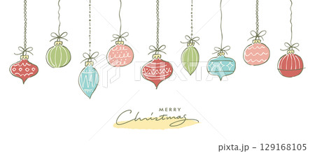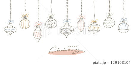 つり下がったクリスマスオーナメントのイラストセット。ラフな線画とパステルカラー。