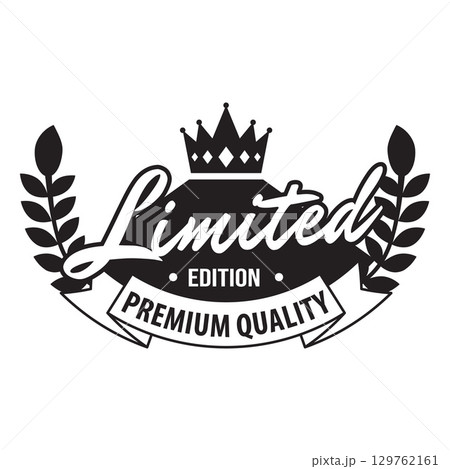 Premium quality black badge with laurel leaves, crown, lettering, ribbon.