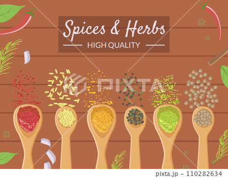 Spices and Herbs Banner Template, Different Cooking Spices in Wooden Spoons, Healthy Cooking High Quality Vector Illustration