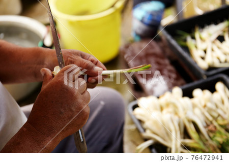 島らっきょうの下ごしらえ作業風景