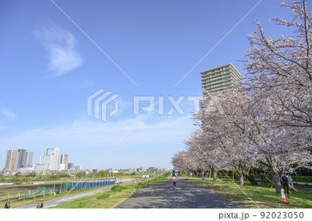 多摩川左岸 満開の桜並木と武蔵小杉の高層ビル群を望む多摩川河川敷 東京都大田区