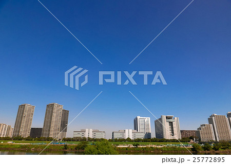 多摩川沿いの高層ビル群の風景