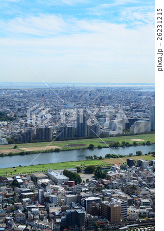 多摩川沿いの街並みと河川敷の運動場 東京都大田区