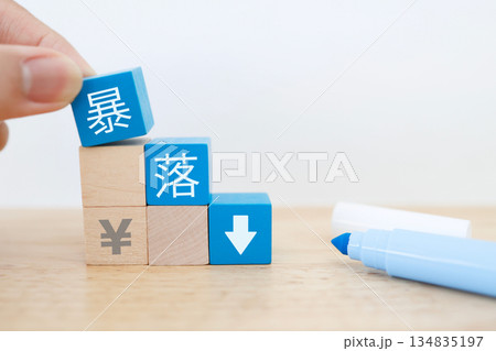 暴落と円マークと下矢印のイメージ。白背景にコピースペース。