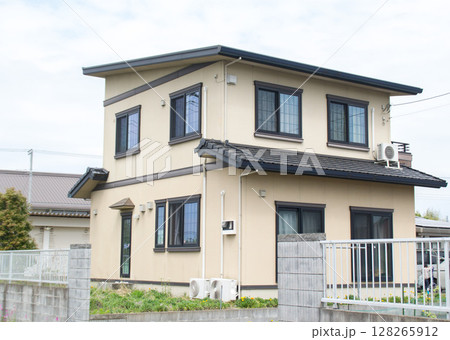 角地に佇む落ち着いた雰囲気の優しい色使いの切妻屋根の軒が深い瀟洒でオシャレで美しい戸建て住宅