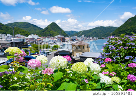 伊豆・下田のあじさい祭りの紫陽花と下田市街