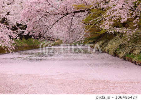 青森県弘前市下白銀町弘前公園 弘前城外濠さくらの花筏とソメイヨシノ