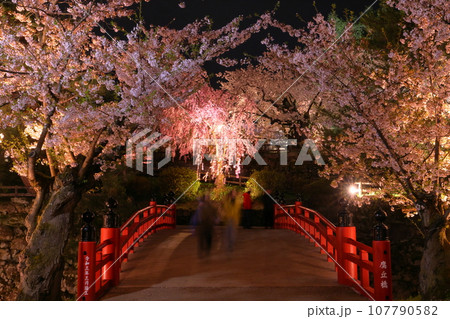 青森県弘前市下白銀町弘前公園 弘前城内濠にかかる鷹丘橋とライトアップされたソメイヨシノやベニシダレ桜