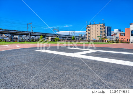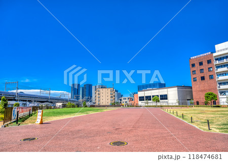日本の東京都市景観 東急電鉄 下神明駅や新幹線などを望む