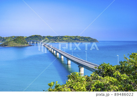 山口県下関市 コバルトブルーの海と快晴の角島大橋