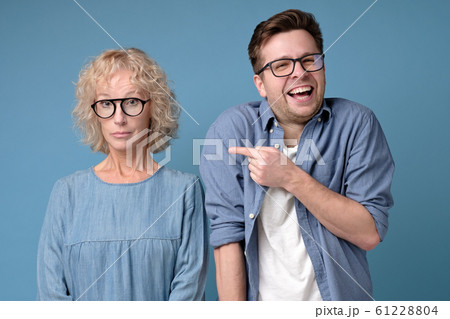 Cheerful handsome man laughing at his annoyed girlfriend, isolated