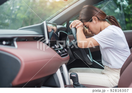woman feeling stress and angry during drive car long time. Asian girl tired and fatigue having headache stop after driving car in traffic jam. Sleepy, stretching and drunk concept