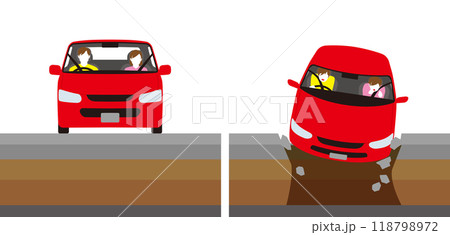 正面を向いている乗用車とドライバーと助手席。陥没した道路に落ちてと驚くドライバーと助手席の女性