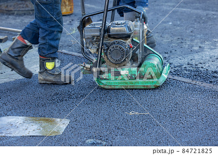 道路転圧 タンピングランマーで地面を突き固める 現場作業員