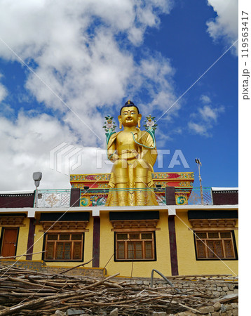 インド北部の小チベットといわれるラダック東部のリキルゴンパに建つ金色に輝く菩薩像といわれる仏像