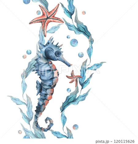 Seahorse, sea blue algae with leaves wriggling in wave with bubbles and coral starfish. Hand drawn watercolor illustration of underwater world. Seamless vertical border pattern for long projects