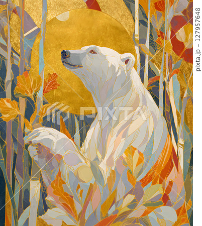 神秘的なブルーの中に浮かぶ蓮とシロクマの幻想的なアートイラスト