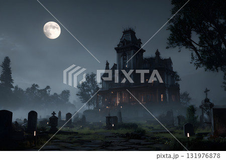 雷鳴の夜に浮かぶ不気味な古城とコウモリの群れ。恐怖と幻想の風景