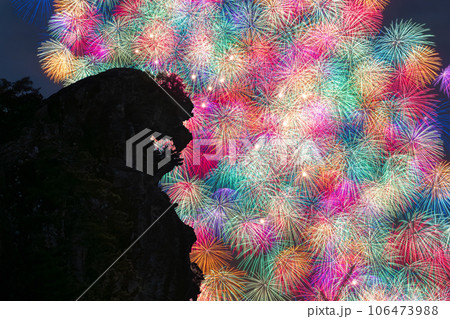 世界遺産 獅子岩に上がる彩色千輪 熊野大花火大会