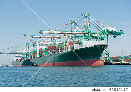 アメリカ、ロングビーチ港、コンテナ船、貨物船、コンテナクレーン、荷下ろし、コンテナ船