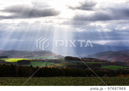 北海道美瑛、雲間から差し込む朝の光・日本