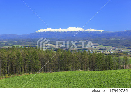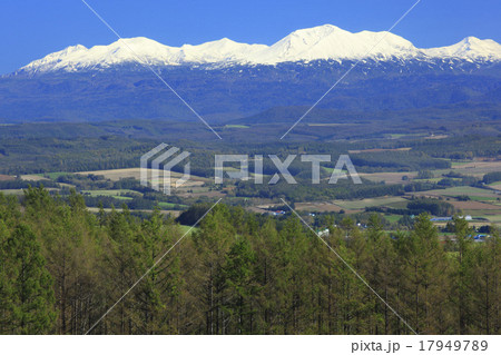 北海道 上富良野町 冠雪の大雪山と丘陵地帯