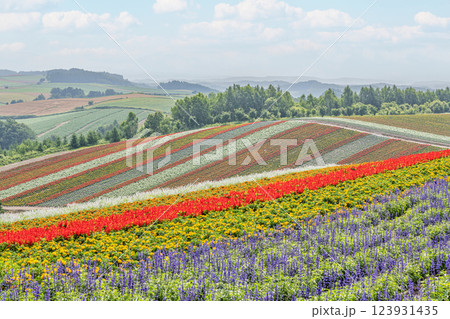 北海道美瑛町 美しい花模様が広がる初夏の四季彩の丘