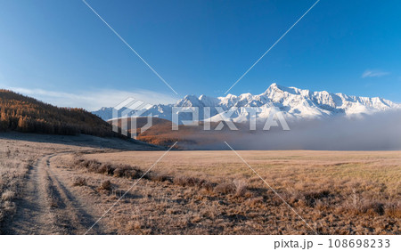 Scenic motley autumn landscape with yellow larch trees on sunlit snow hill and snow mountain range under blue sky. Vivid autumn colors in mountains. Sunlight and shadows of clouds in good weather.