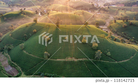 Beautiful aerial view of Long Coc tea hills. Long Coc in Phu Tho Province, Vietnam