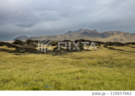 Panoramic view of meadow field with mountain on Estrahorn, Iceland. Nature, travel, winter background, or wallpaper