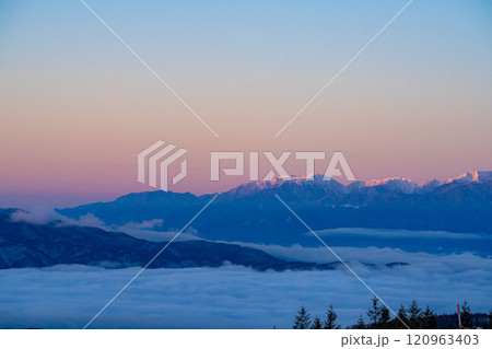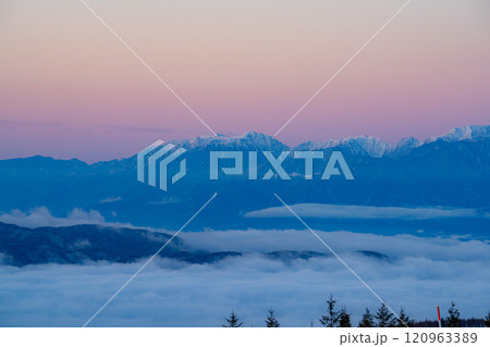 【冬素材】冬の霧ヶ峰から見る朝焼けに染まる南アルプス【長野県】