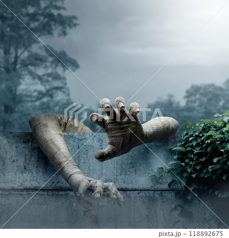 Mummy hands have dirty bandages on them sticking out of wall. Mummy, devil, evil, satan or zombie hands are trying to grab something or someone. The scene has dark and creepy