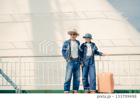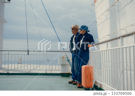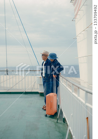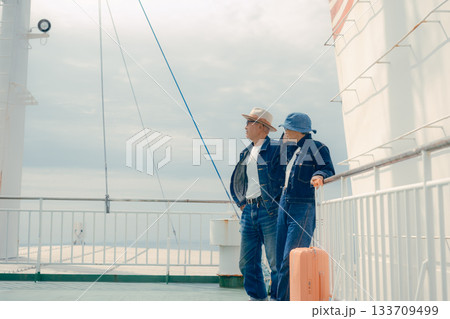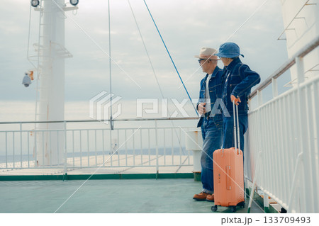 フェリーのデッキで旅行を楽しむシニア夫婦とスーツケース