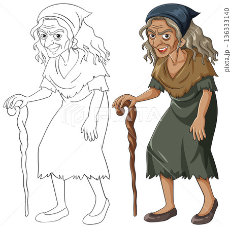 Old Woman with Cane in Tattered Clothes Vector Illustration