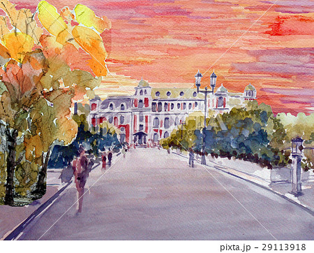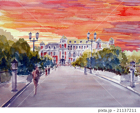 夕焼けの中の島公会堂 手書き 大阪観光 スケッチ