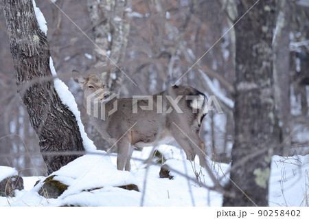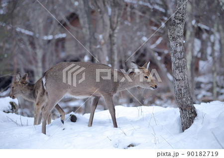 寒さ厳しい雪山で餌を探す野生の鹿(ニホンジカ)