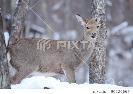 寒さ厳しい雪山で餌を探す野生の小鹿(ニホンジカ)