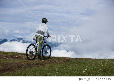 Riding mountain bike on beautiful mountain top