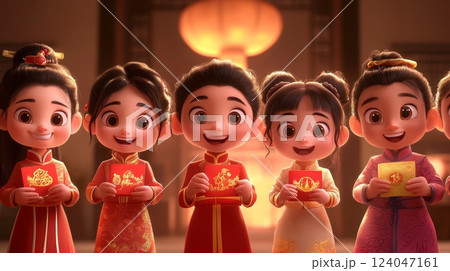 Five Asian children, dressed in traditional red and gold clothing, hold red envelopes, celebrating Chinese New Year. The image is a depiction of a joyful occasion
