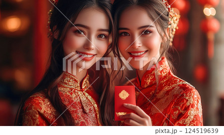 Two radiant women in ornate red traditional dresses celebrate Chinese New Year, smiling warmly while holding a red envelope, symbolizing luck and prosperity amidst festive lantern decorations.