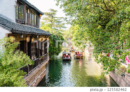中国 江南六大水郷のひとつ、同里水郷の運河をゆく観光遊覧船