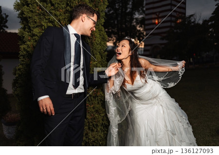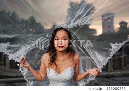 Asian bride smiling wearing wedding dress and veil in sunset lig