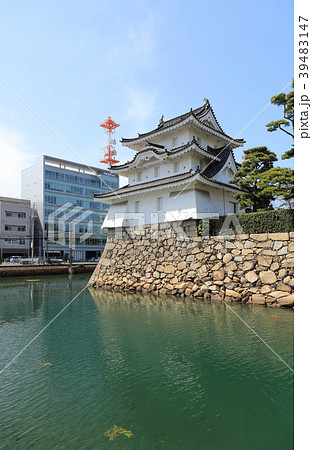 高松城跡の艮櫓と中堀、瀬戸大橋通り沿いの街並み