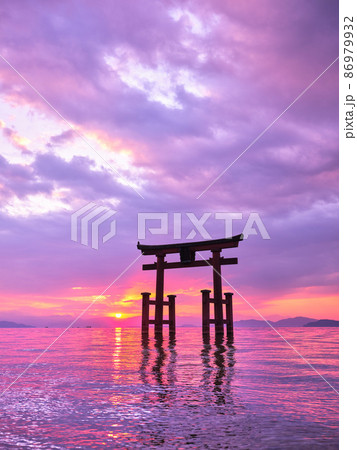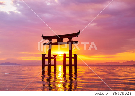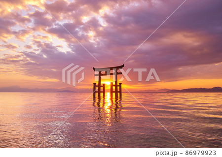 滋賀県 白髭神社の湖中大鳥居 日の出