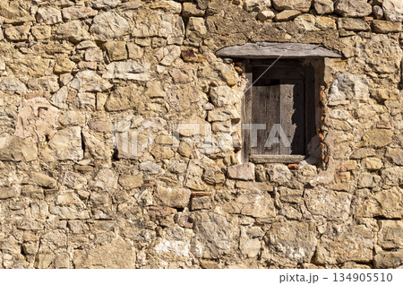 wooden window recessed in a stone wall