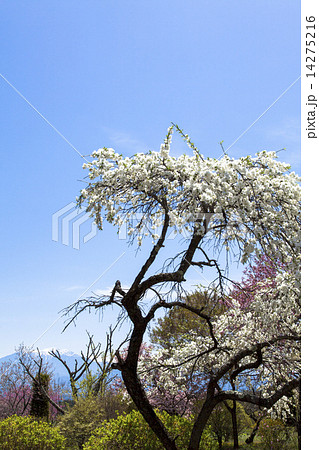 長野県駒ケ根市の上の山の枝垂れ桜と残雪の中央アルプス
