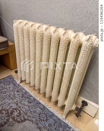 classic white radiator with metallic ornaments, installed in a cozy indoor space. High quality photo