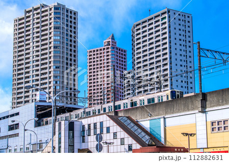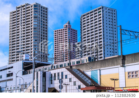 日本の相模原都市景観 橋本駅(南口)や発車した電車、駅前(北口)にそびえるタワーマンションなどを望む