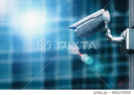 External security camera on pole in front of glass building wall