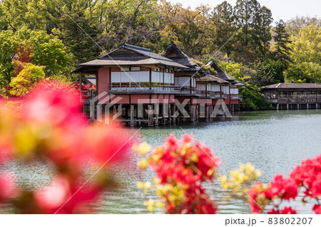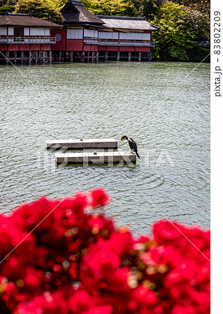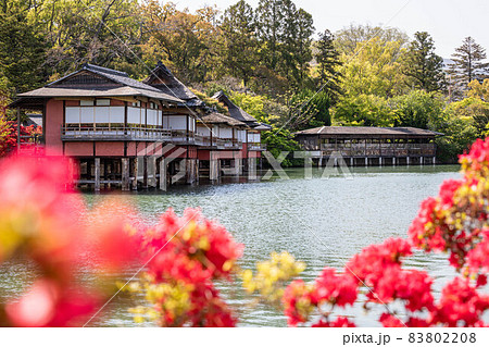 長岡天満宮八条ヶ池に浮かぶ錦水亭・数寄屋造りの座敷と満開のキリシマツツジ